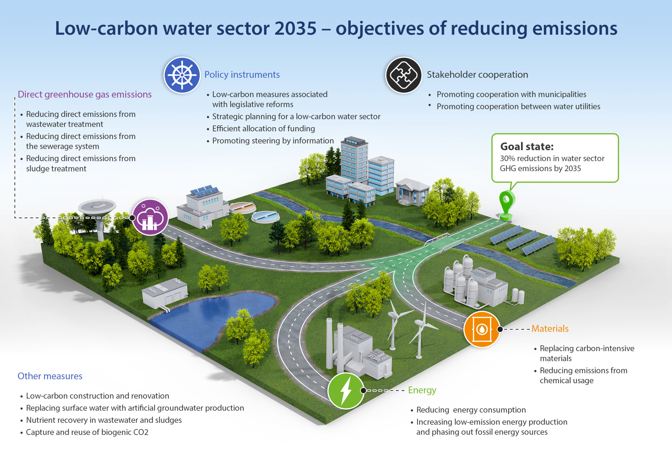 Other measures include reducing indirect emissions from wastewater and sludge treatment as well as emissions caused by drinking water production and by sewer systems. Indirect emissions are reduced by, among other things, improving the energy efficiency of water services and phasing out fossil energy sources. These measures, together with intensified use of waste heat from treated wastewater as an energy source, especially in district heating, would enable the entire Finnish water sector to become energy positive. Furthermore, the roadmap steers towards reducing the use of chemicals and carbon-intensive materials.