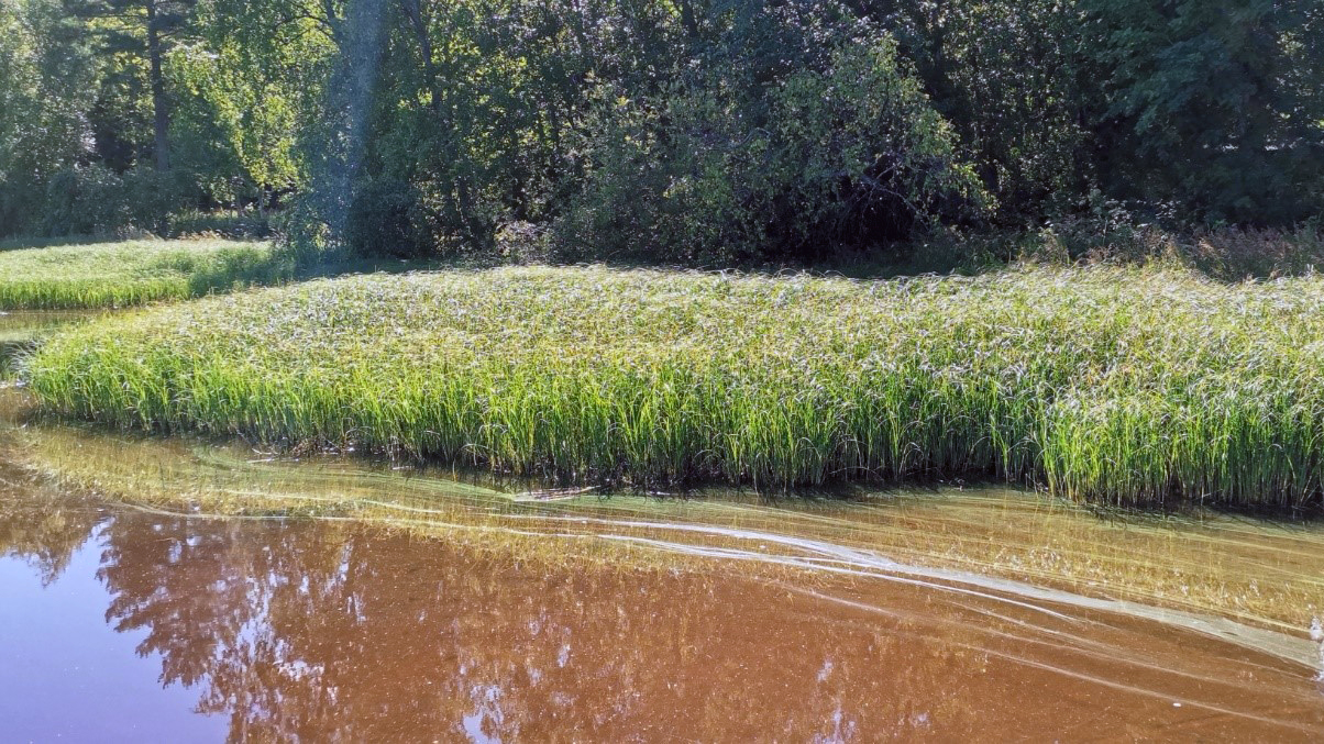 Kuva: Sinilevä voi muodostaa juovia veteen, tässä niitä näkyy rantakasvuston suojassa. © Anne Mäkynen, Pirkanmaan ELY-keskus