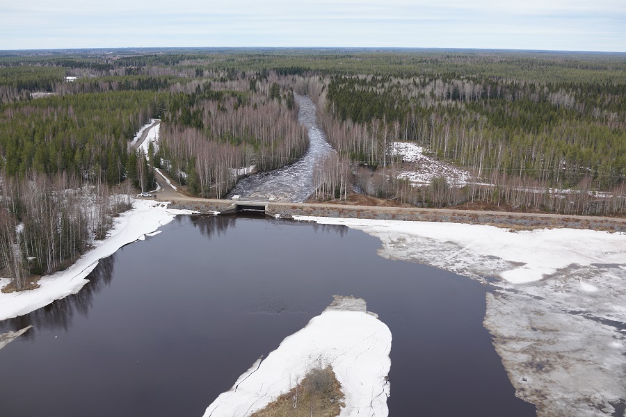 Bild: Regleringsdammen vid Säksforsen i Nedervetil, Kronoby 13.4.2024. © NTM-centralen i Södra Österbotten