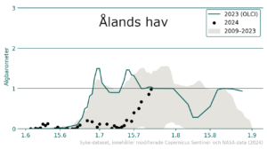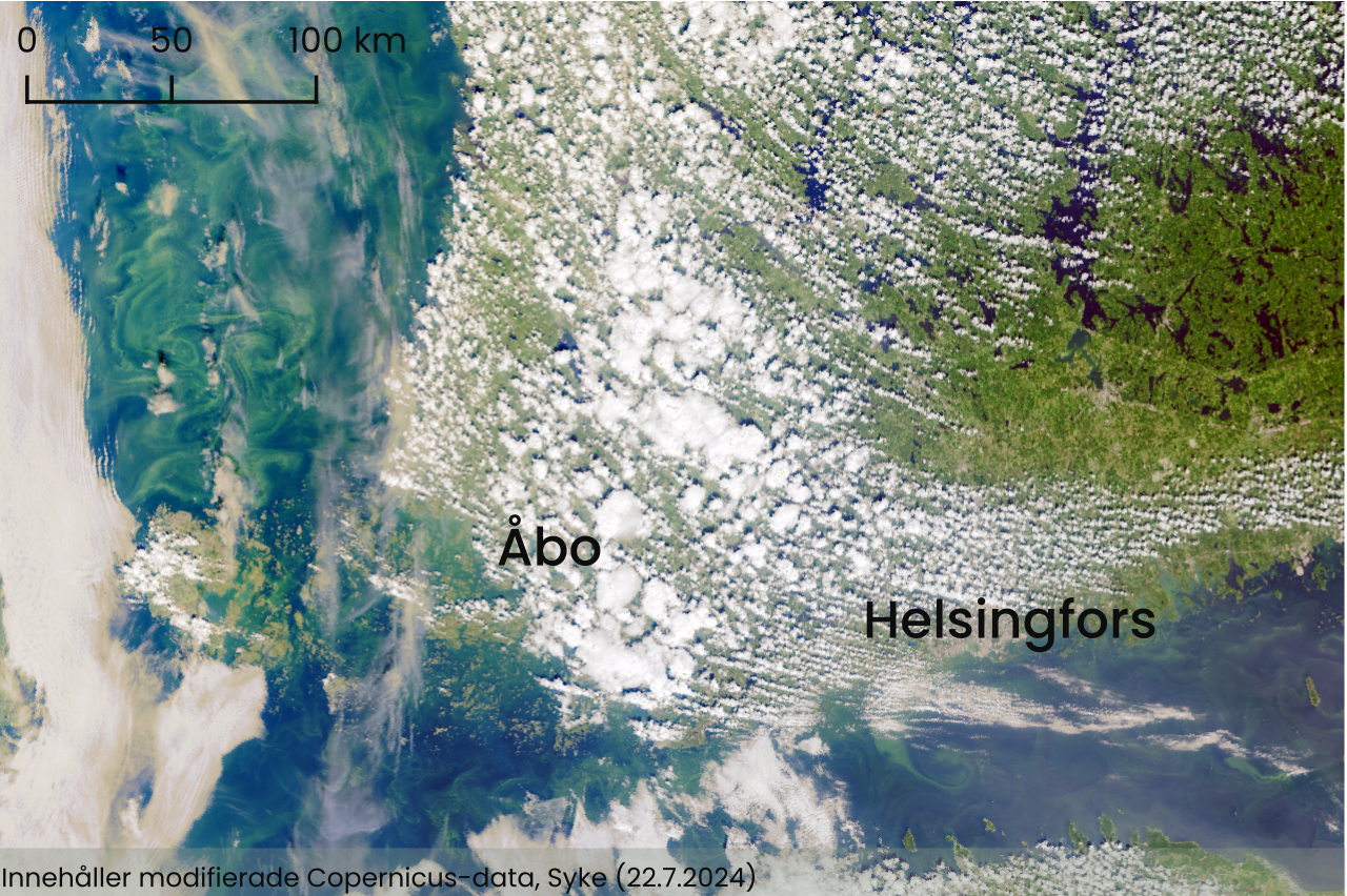 Bildtext: Cyanobakterier kan observeras särskilt utanför Åland och i Bottenhavet 22.7.2024.