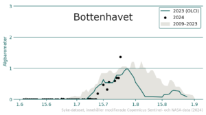 För tidpunkten har ganska lite cyanobakterier observerats i insjöarna, men vid kusten och på öppet hav finns det rikligt med observationer