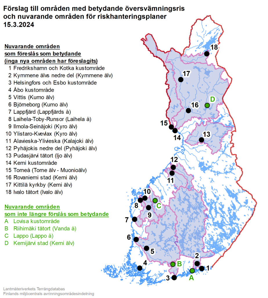 Under den pågående planeringsperioden föreslogs inga nya områden med betydande översvämningsrisk. Däremot ansåg man att det inte längre råder betydande översvämningsrisk i fyra områden som tidigare har hört till denna kategori. Kemijärvi uteslöts från kategorin efter att höjningen av dammen blev klar. I Riihimäki kunde alla vägtrummor med bristfällig dimensionering ändras till rörbroar, vilket avsevärt minskar översvämningsrisken. I Lappo visar nya, noggrannare översvämningskartor att det finns färre objekt med översvämningsrisk än tidigare. I Lovisa har man genomfört eller planerar att genomföra åtgärder som förhindrar eller minskar översvämningsrisken.