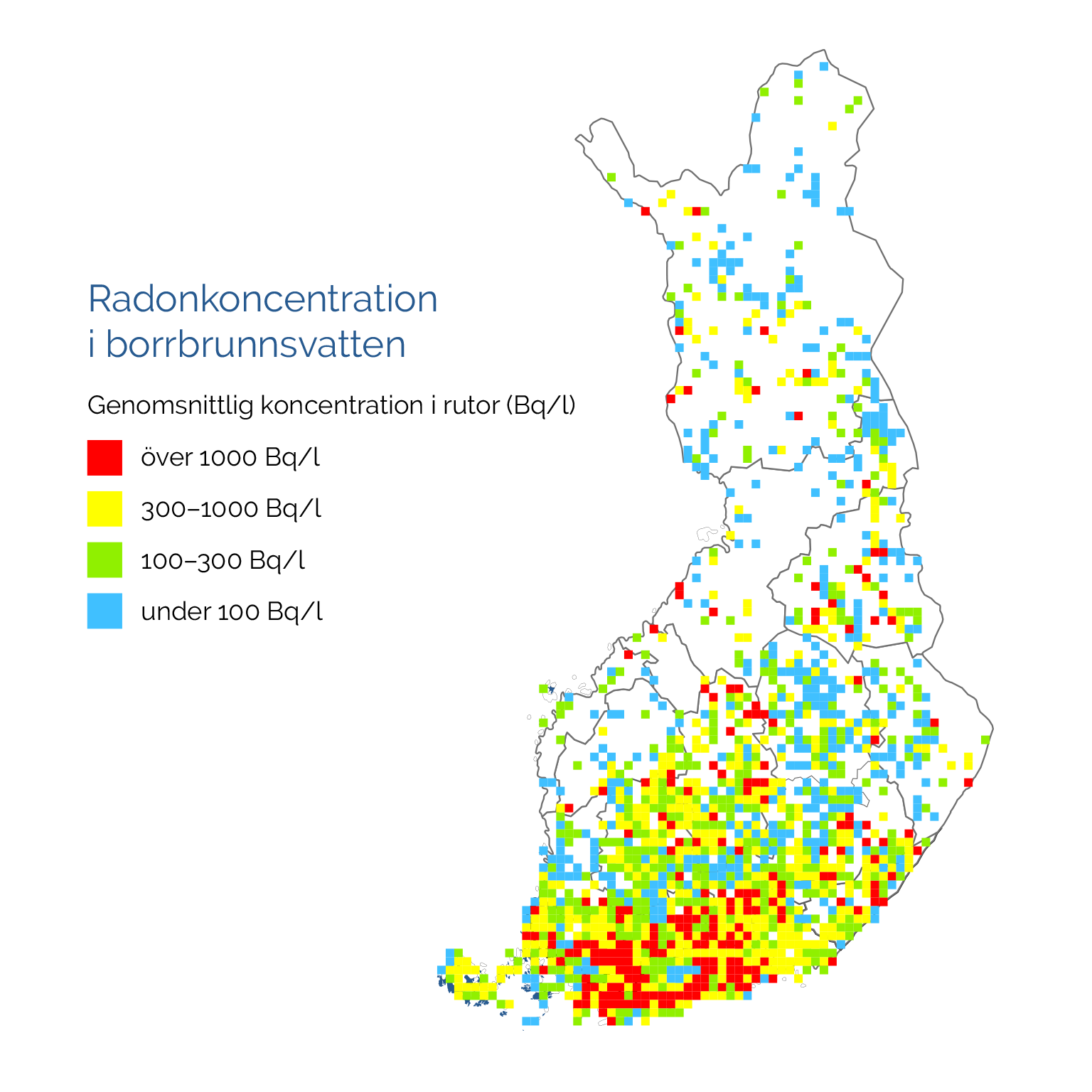 Radon förekommer särskilt i berggrundvattnet i granitområdena i södra Finland. Radonkoncentrationer som överskrider maximivärdena kan dock förekomma även på andra håll i landet, ibland också i vattnet i schaktbrunnar. Dessutom varierar koncentrationerna mycket lokalt. Även i små kommuner har tusenfaldiga skillnader i radonkoncentrationerna i brunnar uppmätts.
