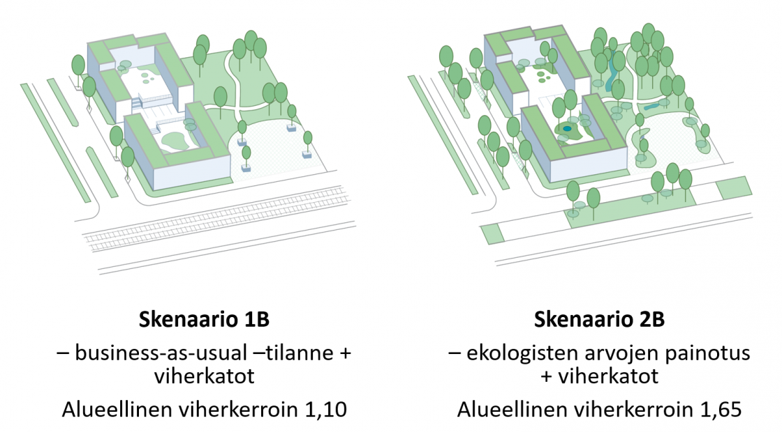 Malmin täydennysrakentamiselle luotiin erilaisia skenaarioita, joissa varioitiin viheralueiden ja erityisesti hulevesien hallintaan tarkoitettujen luontopohjaisten ratkaisujen, kuten viherkattojen ja katujen biosuodatusaltaiden määrää ja laatua.