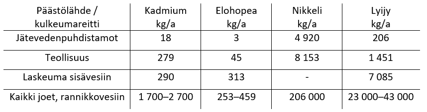 Kadmiumin (Cd), elohopean (Hg), nikkelin (Ni) ja lyijyn (Pb) päästöt ovat kaikkein suurimmat eteläisillä vesienhoitoalueilla (VHA1-3). Teollisuuden metallipäästöt (Cd, Hg, Ni, Pb) ovat pääosin peräisin metsäteollisuudesta, energiantuotannosta sekä kaivos- ja metalliteollisuudesta. Kadmiumin, elohopean ja lyijyn laskeuma pintavesiin on selvästi suurempi kuin pistemäinen kuormitus (taulukko 1). Kokemäenjoen–Saaristomeren-Selkämeren (VHA3) sekä Oulujoen–Iijoen vesienhoitoalueiden (VHA4) happamien sulfaattimaiden maaperästä huuhtoutuu vesistöihin suuria määriä nikkeliä ja kadmiumia.