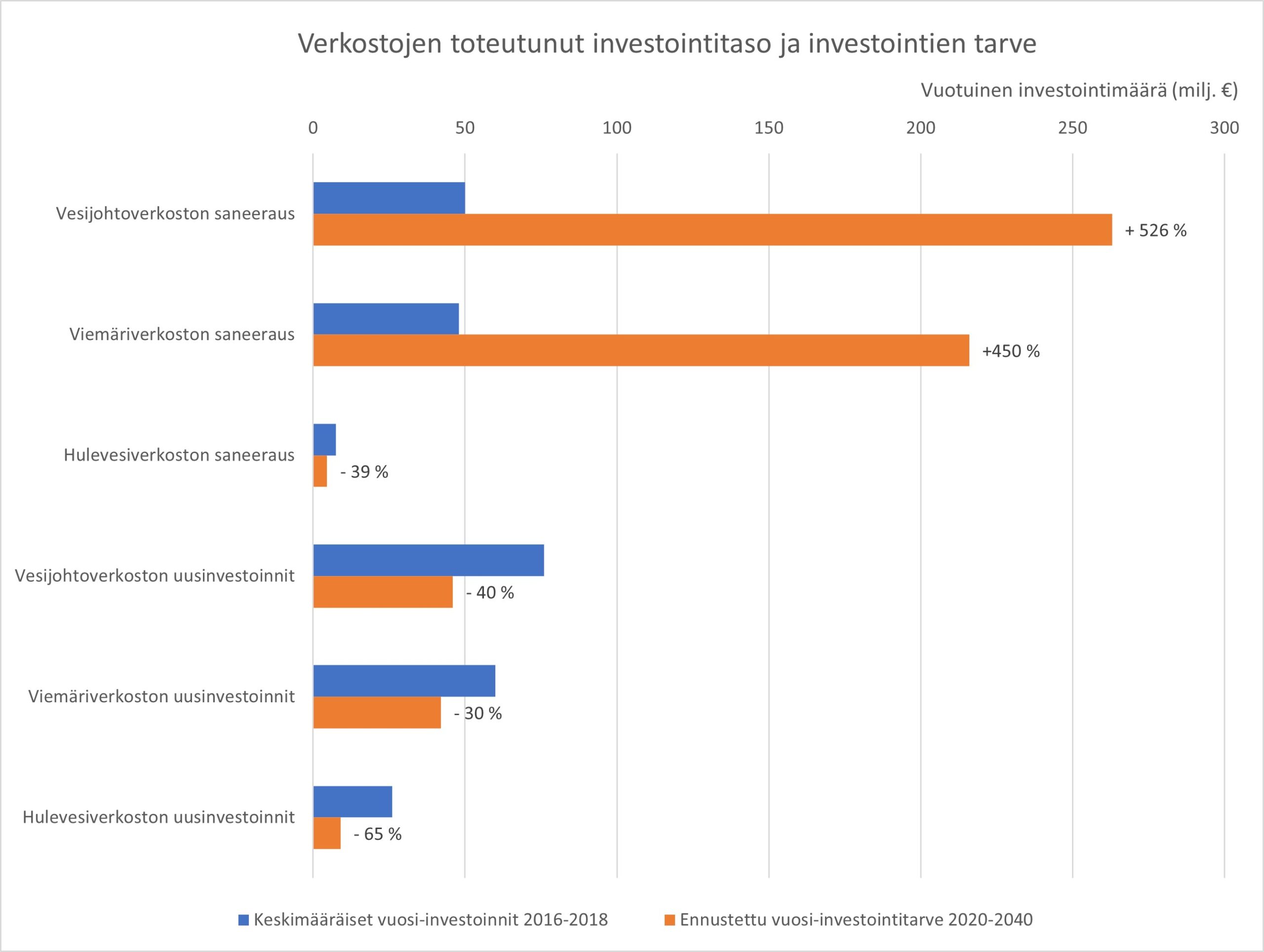 Jotta kunnostus pysyy samassa tahdissa kuin verkostot ikääntyvät, pitäisi Suomessa kunnostaa joka vuosi 1–2 prosenttia vesi- ja jätevesiverkostojen pituudesta. Kun otetaan huomioon myös verkostojen laajentamistarpeet sekä vesi- ja jätevesilaitosten vaatimat investoinnit, saadaan vesihuoltoinfrastruktuurin investointitarpeeksi 750–800 miljoonaa euroa vuodessa eli yli sata euroa asukasta kohti. 2010-luvun jälkipuoliskolla infrastruktuuriin investoitiin runsaat 400 miljoonaa euroa vuodessa. Kirittävää siis on.